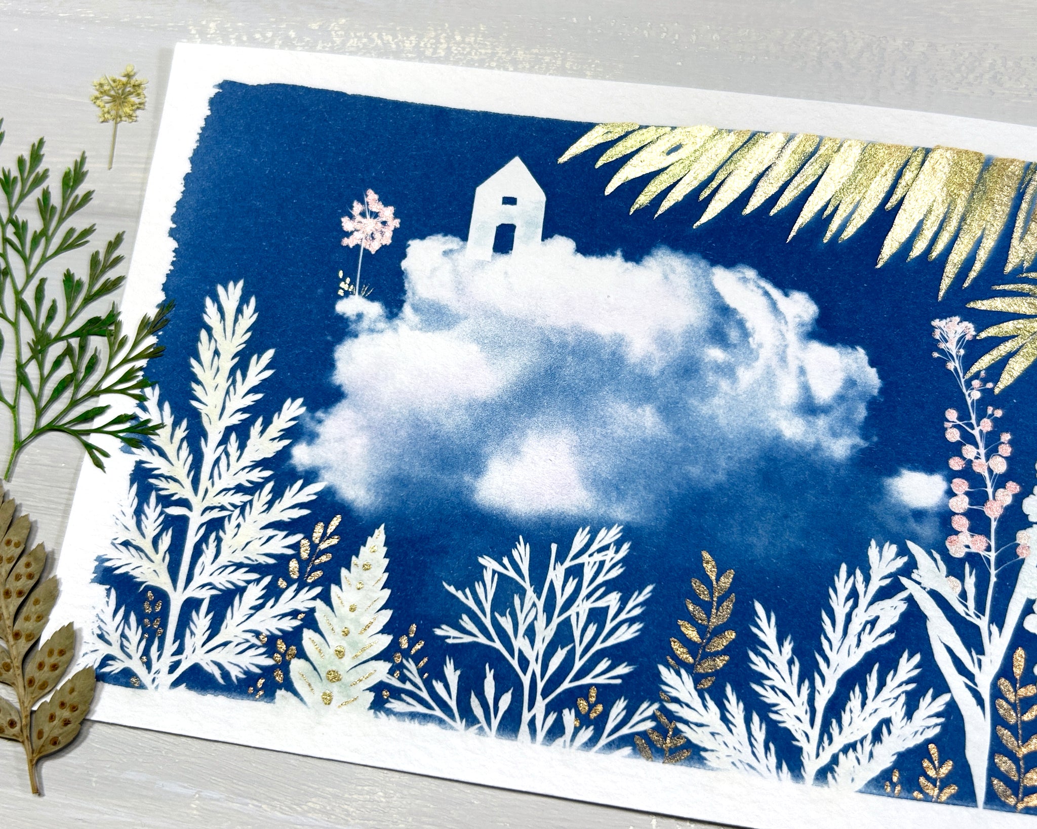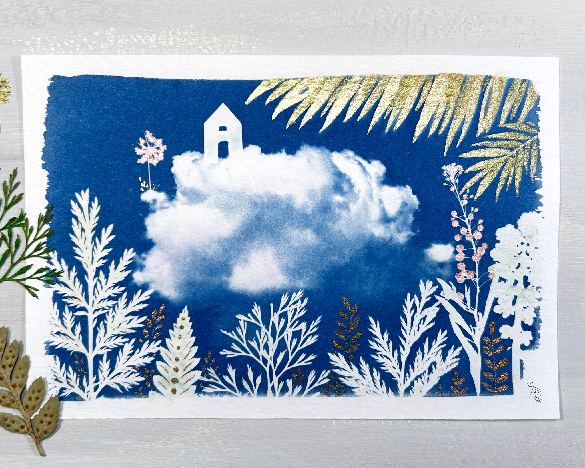 Palmhaven is a cyanotype dreamscape where a small house rests gently on a drifting cloud, cradled by a lush forest below and crowned with shimmering golden palms above. Both grounded and floating, the scene invites a quiet pause—an imagined refuge suspended between earth and sky.