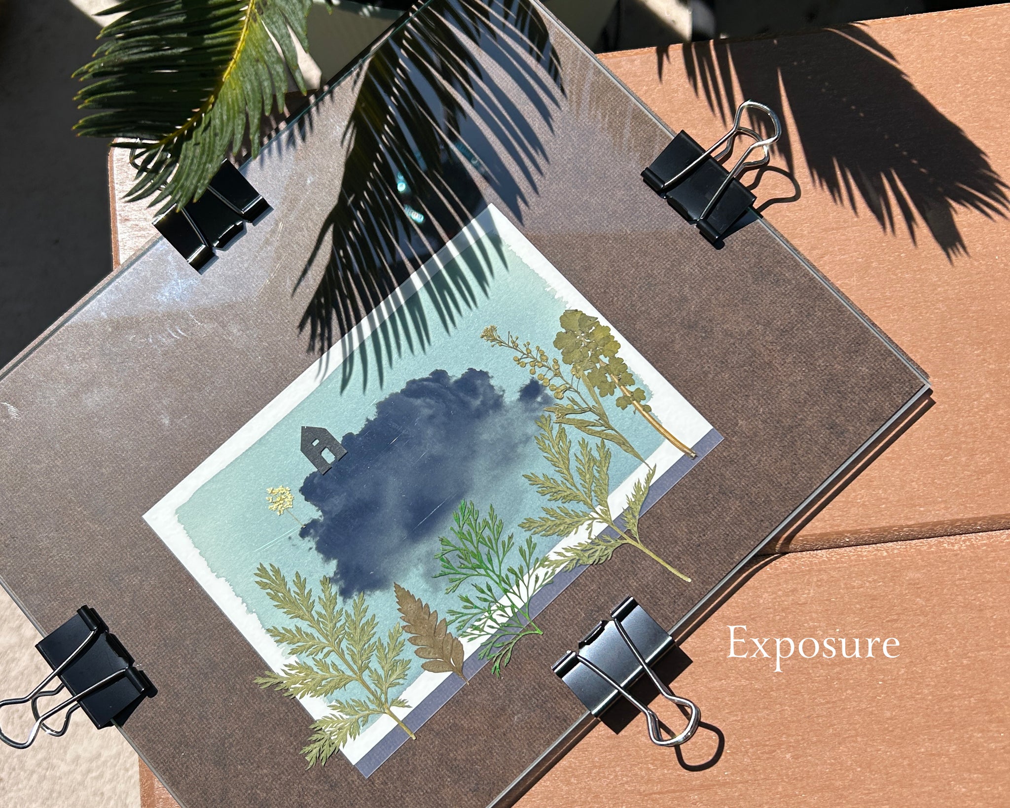 Cyanotypes are created by coating paper with light-sensitive chemistry and exposing it to sunlight. After exposure, the print is washed in water, revealing rich blue tones shaped by light, time, and chance. Each cyanotype is unique.