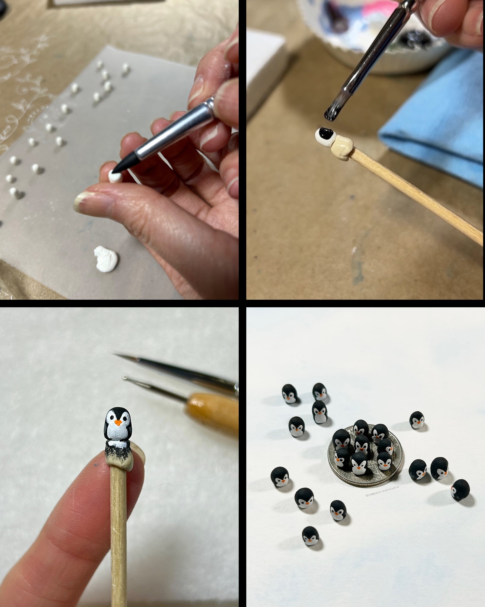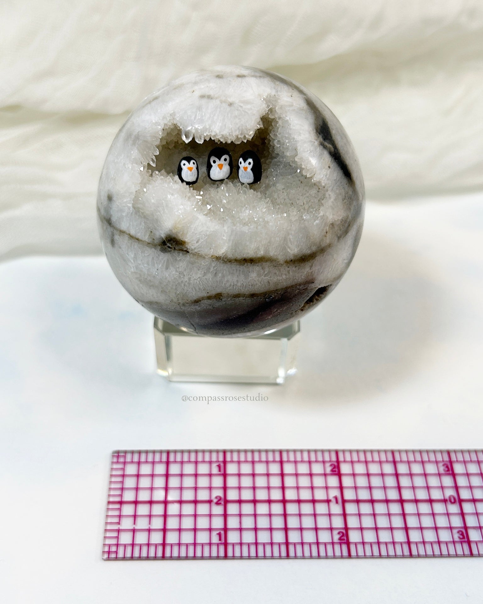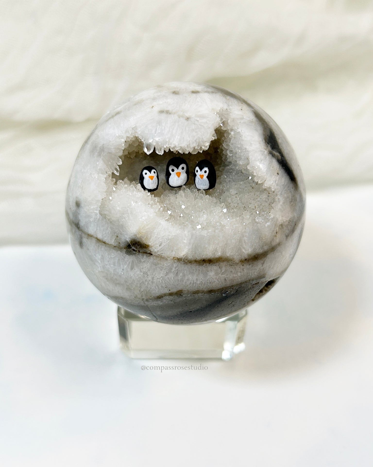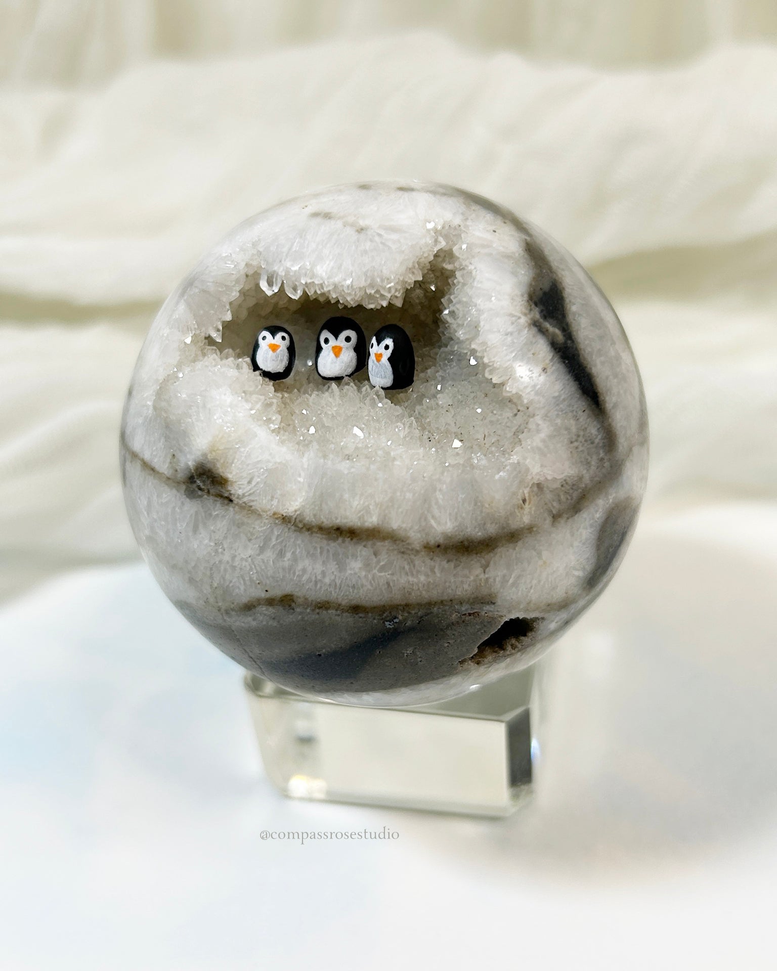 Each tiny penguin is hand-sculpted from clay, hand-painted, and carefully placed inside the geode with tweezers. The process is delicate and precise, making every piece unique.