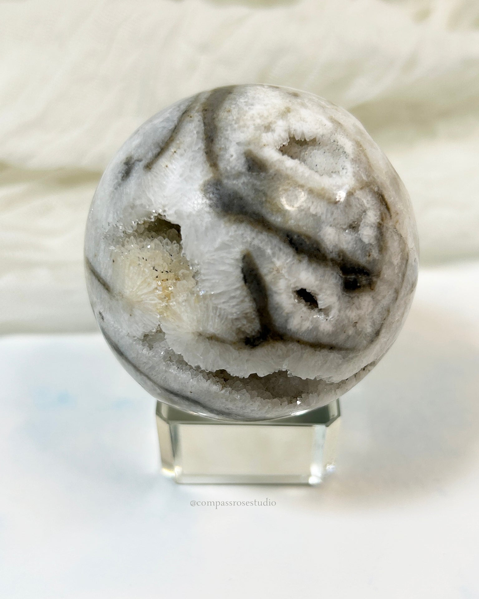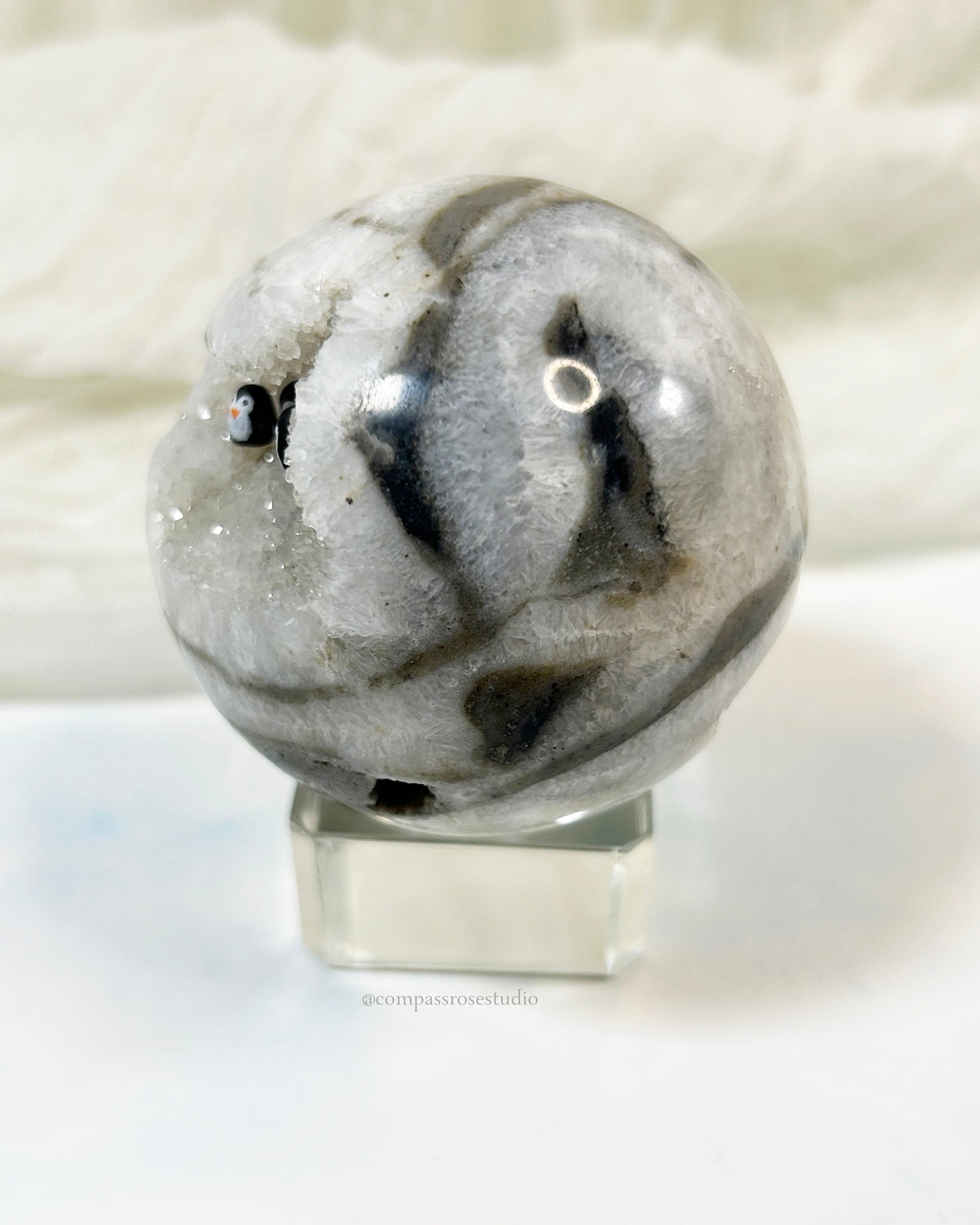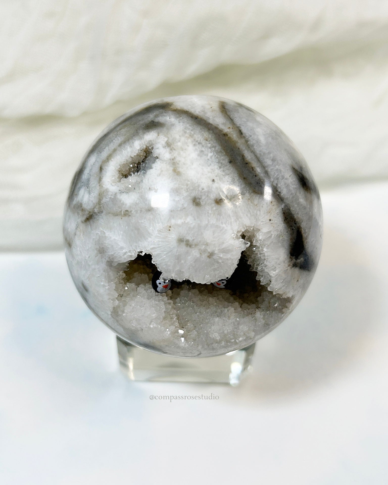 This sparkling Zebra Agate geode sphere is home to three tiny penguins perched on a rocky ledge. Bold stripes, a cozy nook, and a touch of magic.