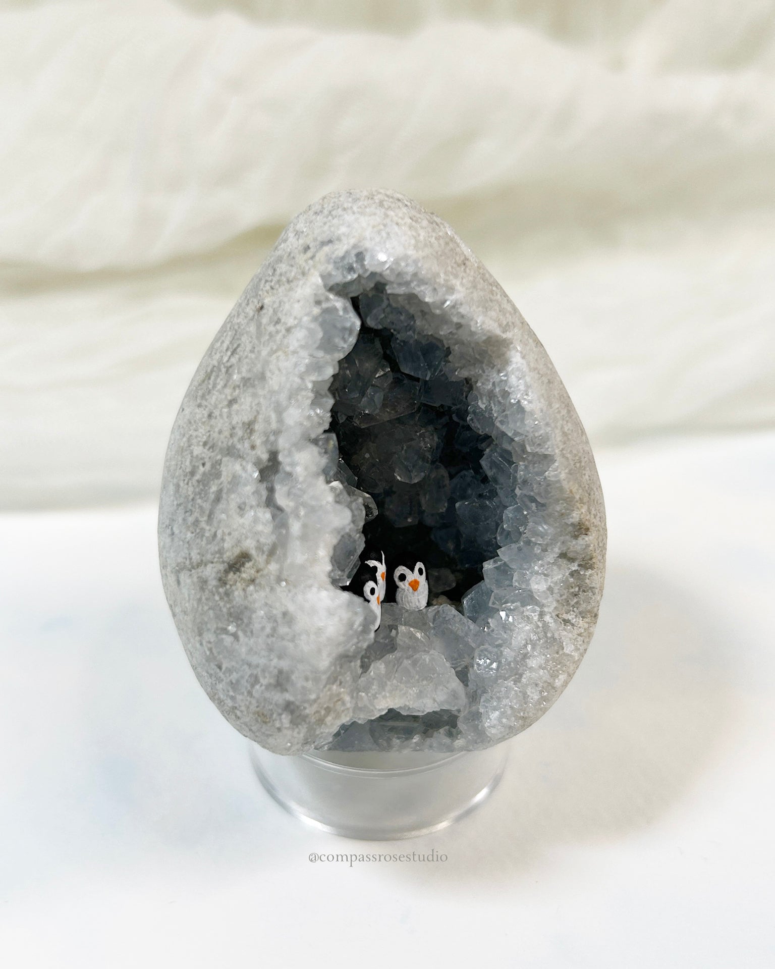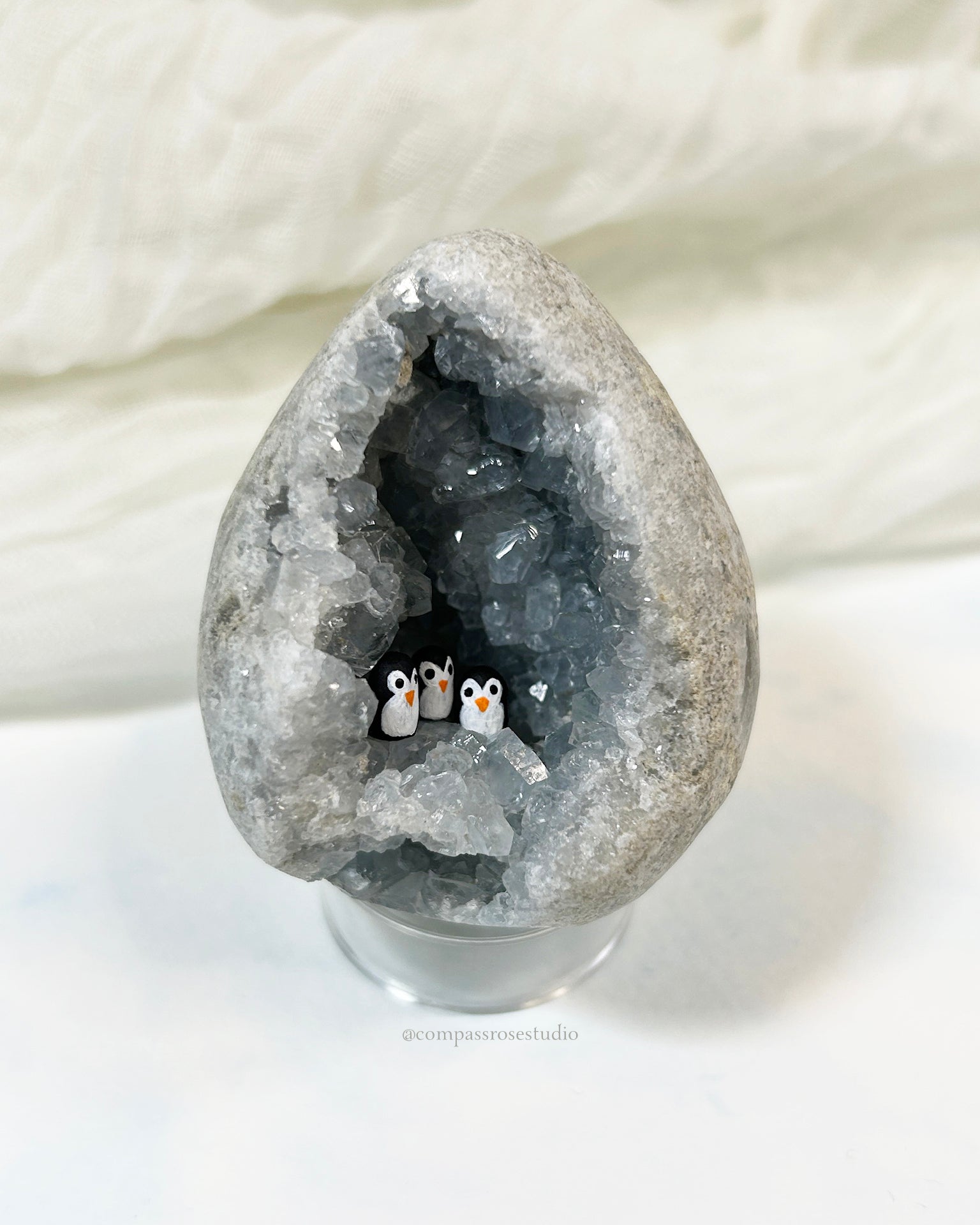Each tiny penguin is hand-sculpted from clay, hand-painted, and carefully placed inside the geode with tweezers. The process is delicate and precise, making every piece unique.