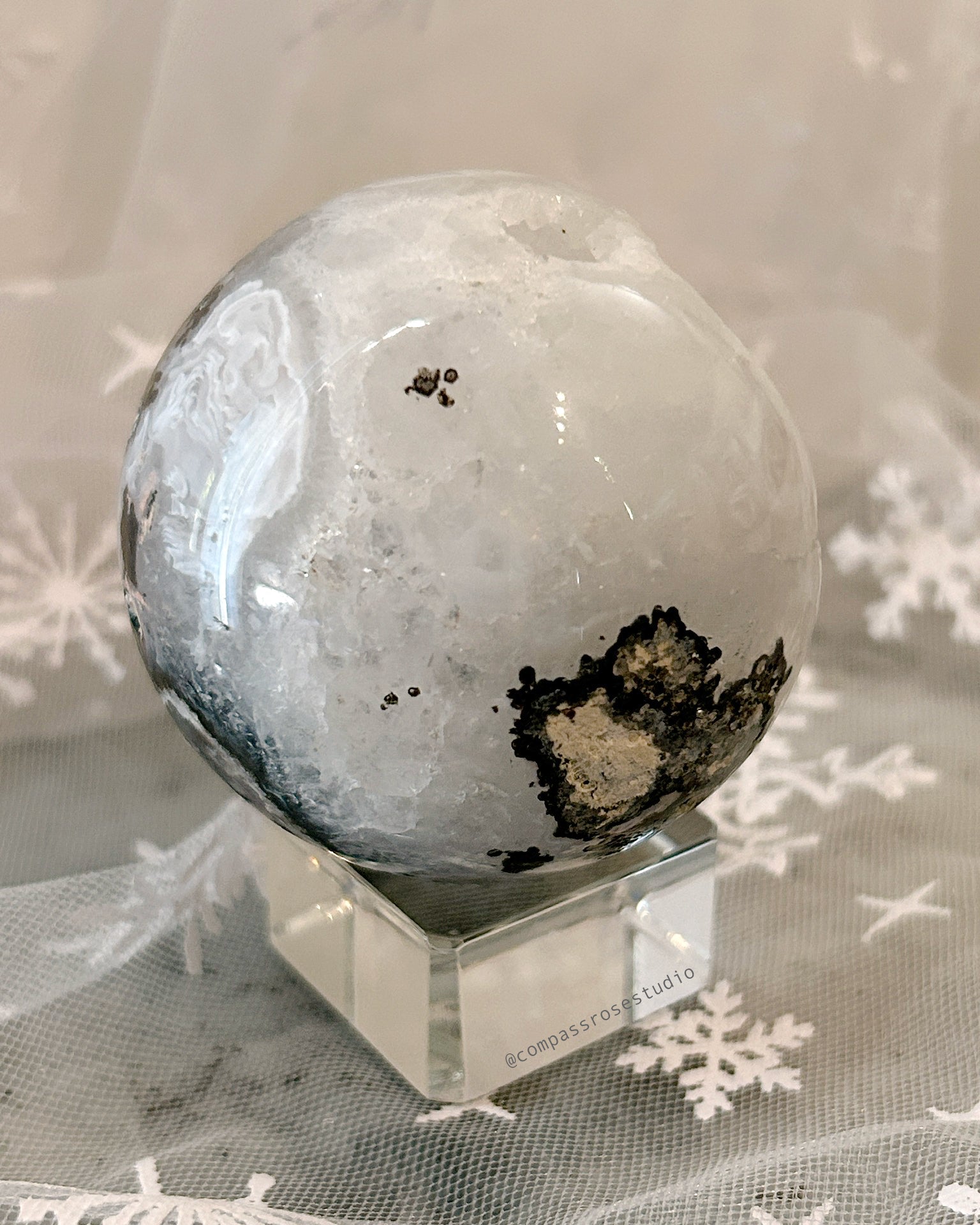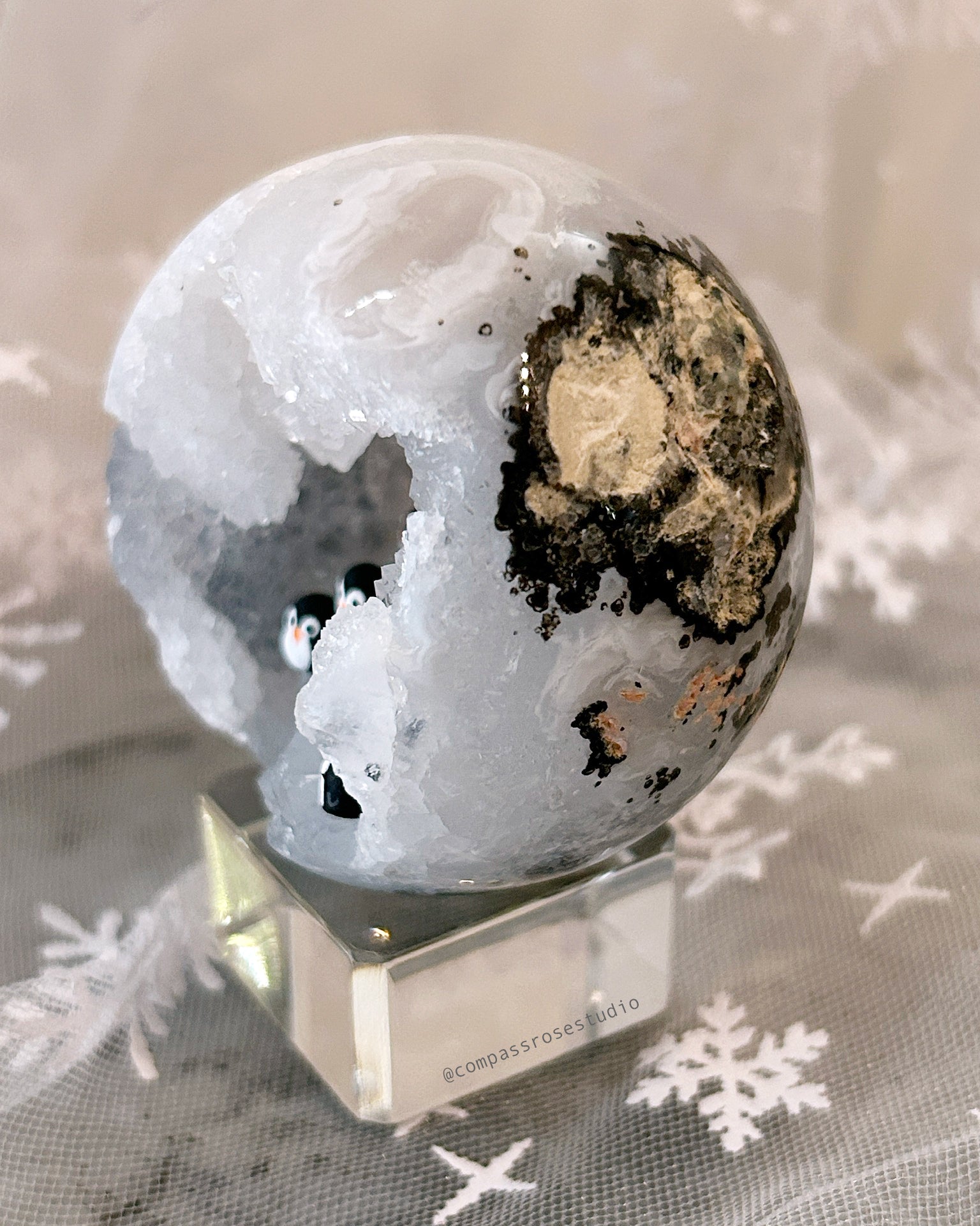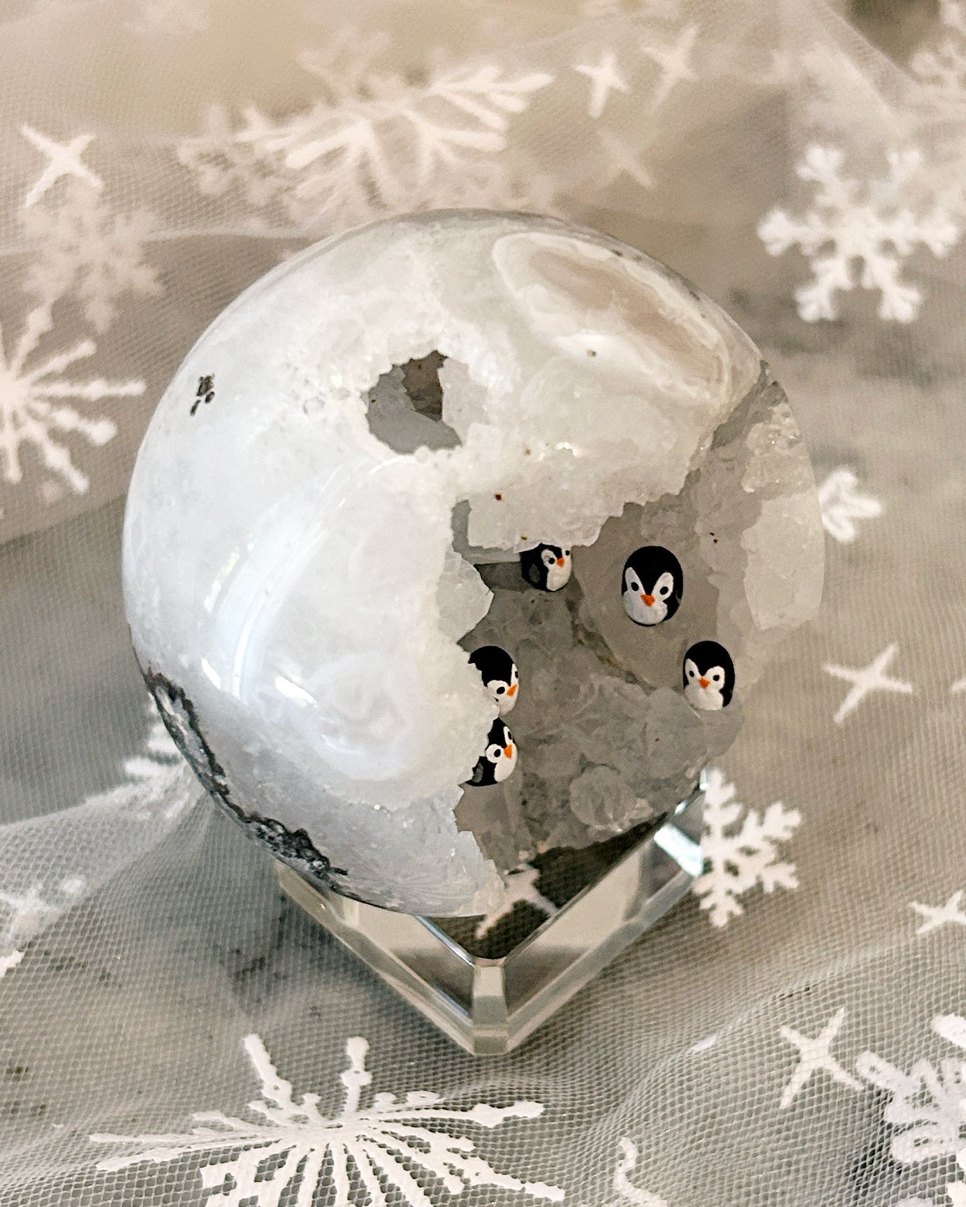Bring home a miniature icy world with tiny hand-sculpted penguins nestled inside shimmering agate geodes. Each geode looks like a sparkling ice cave, creating a magical habitat for these little friends. Every geode sphere comes with the crystal stand shown, perfect for displaying your penguins in their cozy, frozen realms.