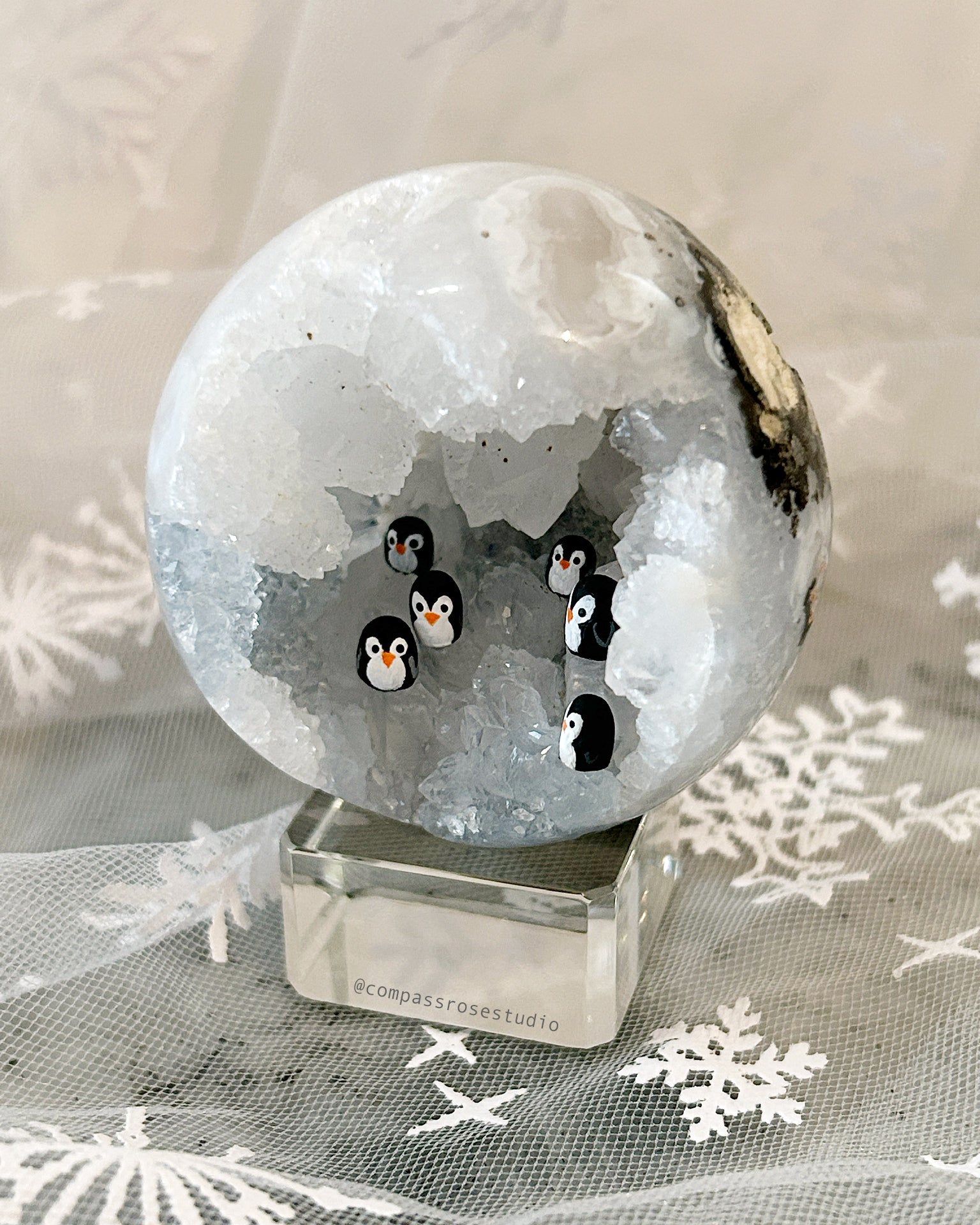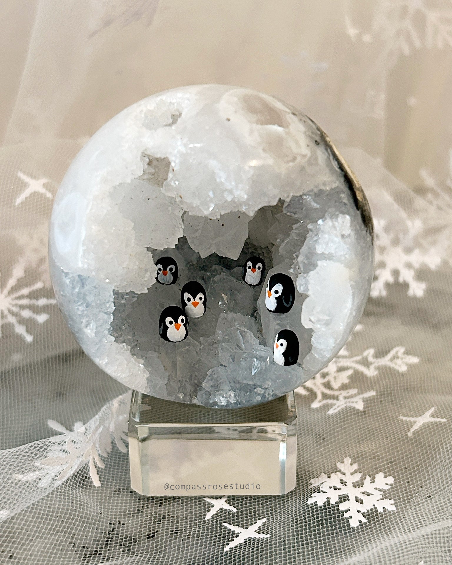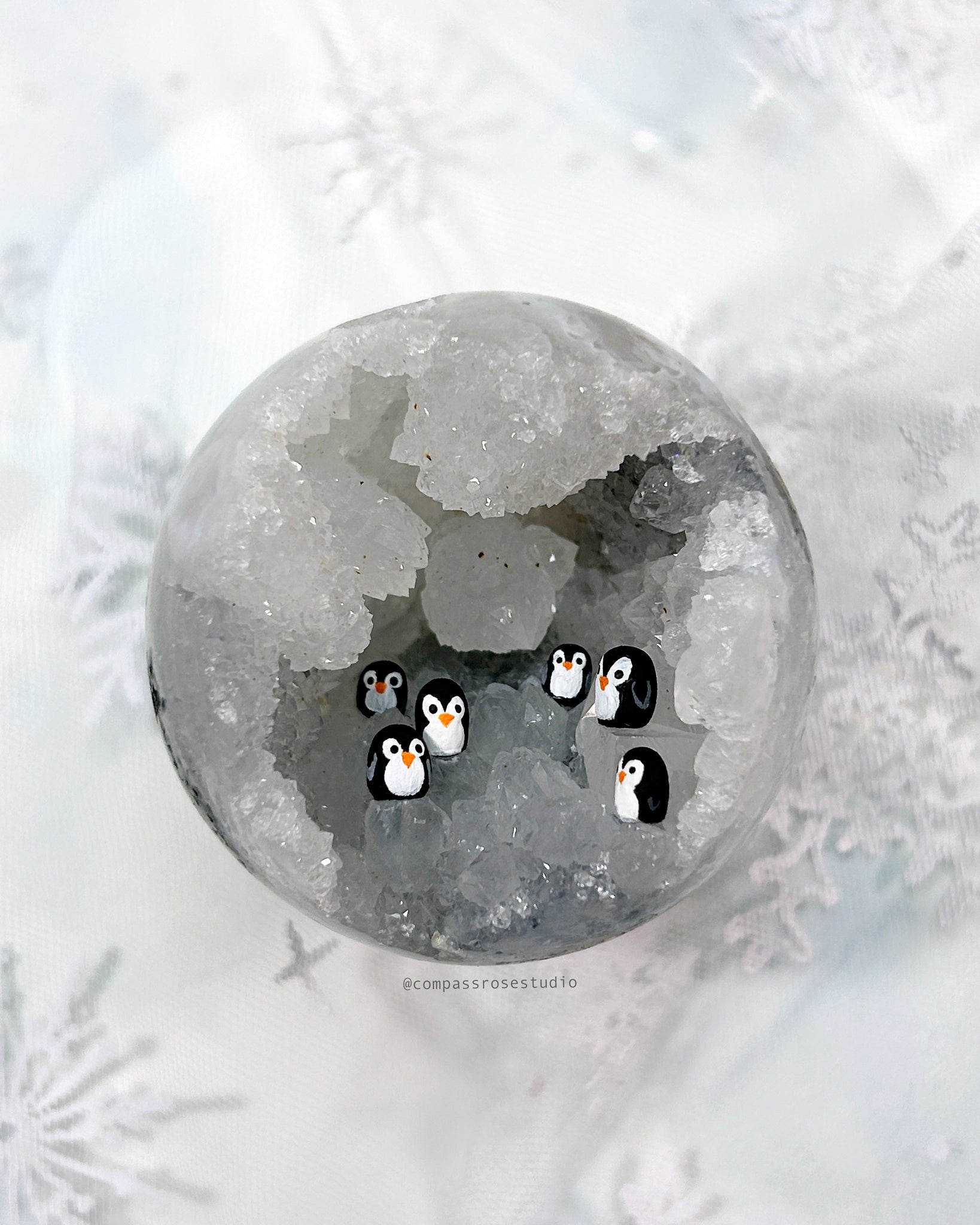 Each tiny penguin is hand-sculpted from clay, hand-painted, and carefully placed inside the geode with tweezers. The process is delicate and precise, making every piece unique.